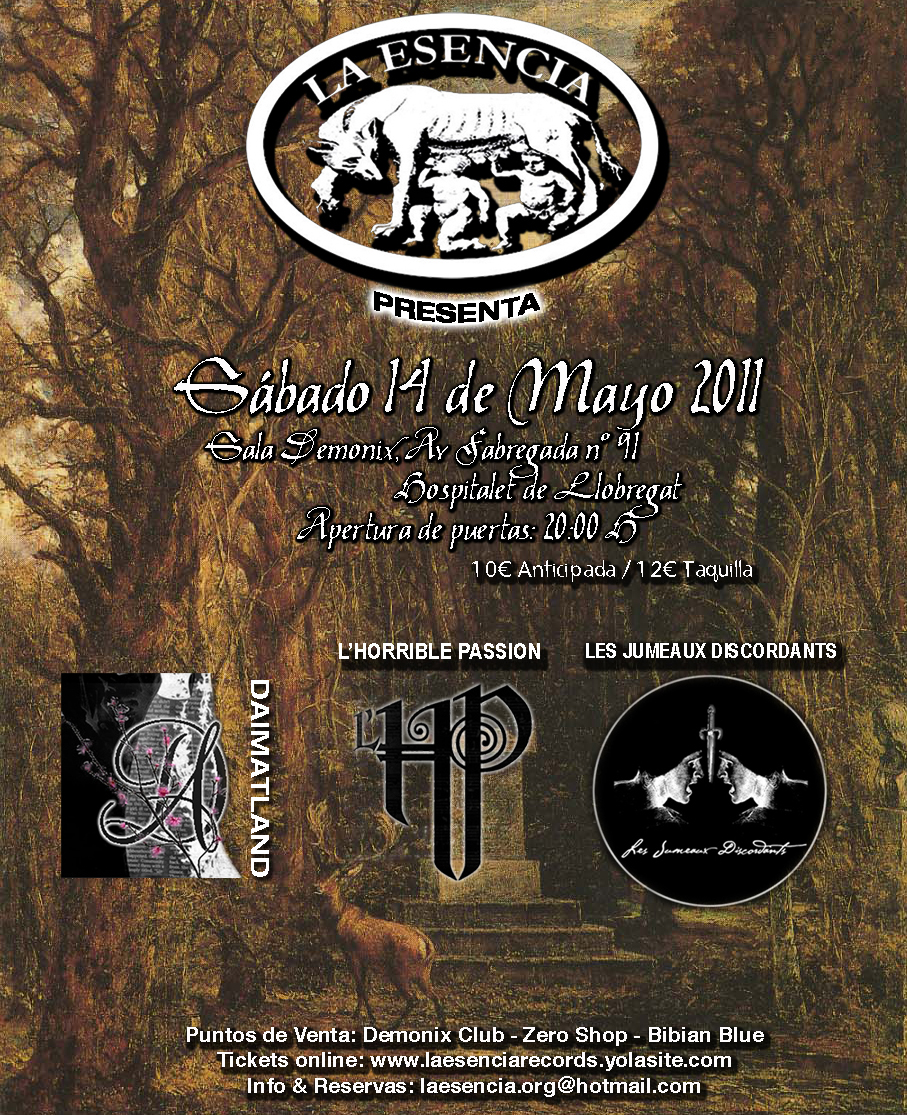El próximo sábado 14 de Mayo a las 20h en la sala Demonix de Hospitalet de Llobregat se realizará un triple concierto para los amantes de los sonidos más sombríos y experimentales. Desde Italia nos llegarán Les Jumeaux Discordants y Daimatland, y abriendo el artista local L’Horrible Passion en una noche de música oscura.