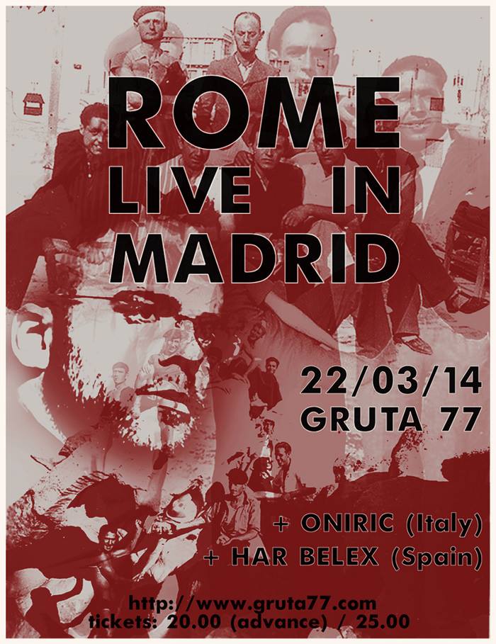 La mítica banda de neo-folk "Rome" dará un concierto único en el estado español el próximo sábado 22 en Madrid, si estáis interesados tenéis más información en el Facebook del evento aquí.