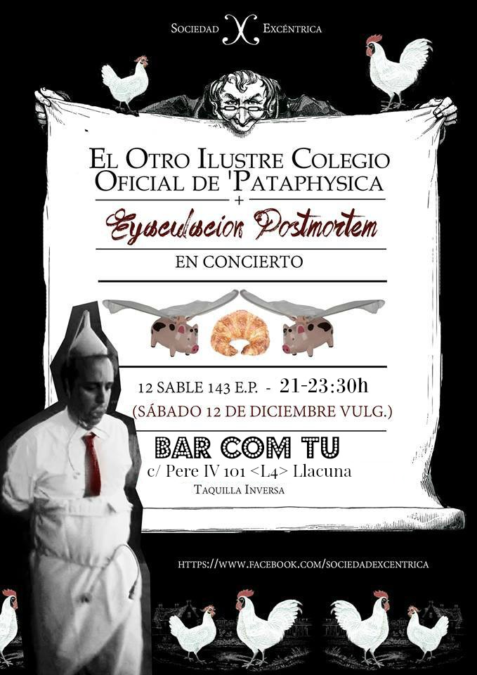 El próximo sábado 12 de Diciembre (12 de Sable del año 143 según el calendario patafísico) tendremos la oportunidad de ver en Barcelona a “El otro ilustre colegio oficial de la ’Pataphisica”, anteriormente conocidos como Funeraria Vergara, en la sala “Com Tu”. Una oportunidad única de ver estos valencianos a caballo entre el cabaret, el post-punk y la ciencia con soluciones imaginarios, la ’Pataphysica. La taquilla es inversa, así que podréis pagar aquello que deseeis a la salida del concierto.