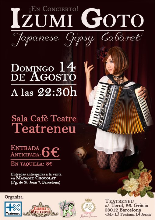A partir de mañana jueves y hasta el próximo sábado en el Dolly Market podréis adquirir las entradas para el concierto de Izumi Goto en el Teatreneu en la tienda de moda lolita, pin-up, victoriana, et al… Madame Chocolat. También podéis adquirilas en la página web del Teatreneu o en las taquillas del teatro.